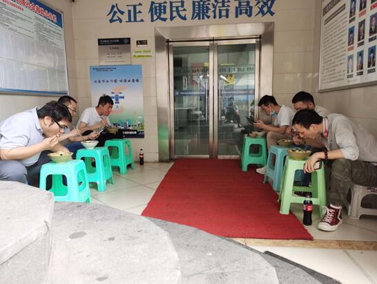 項(xiàng)目組在路邊吃重慶特色紅油小面(市民吃小面都是在街邊支一張小板凳配一張凳子解決)
