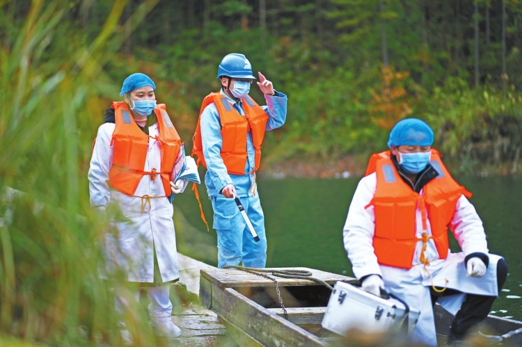2月8日,在臺江縣革一鎮(zhèn)排生村,臺江供電局臺盤供電所黨員王清亮和當(dāng)?shù)匦l(wèi)生部門工作人員乘船前往工作點(diǎn)?!㈤_福 攝影報(bào)道