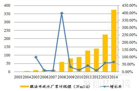 市政大規(guī)模MBR應用和膜法市政水廠規(guī)模變化與膜法水處理行業(yè)產(chǎn)值變化趨勢高度一致