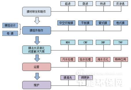 膜法水處理產(chǎn)業(yè)鏈由膜材料研發(fā)和制作、膜組件制作、膜法水資源化成套解決方案、運營和維護組成。其中膜法水資源化整體解決方案又涵蓋了工藝方案、投標、詳細設計、系統(tǒng)集成、施工安裝、系統(tǒng)試車、技術支持和售后服務等流程。其中,膜材料/膜元件制作和研發(fā)在整條產(chǎn)業(yè)鏈中擁有更高的技術先進性和盈利性。