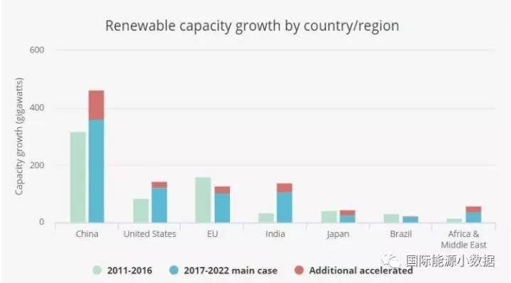 過去對于可再生能源發(fā)展規(guī)模預(yù)測曾經(jīng)偏保守的IEA現(xiàn)在預(yù)測,2017-2022年間全球可再生能源新增裝機將至少達到920吉瓦(其中風(fēng)電321吉瓦、光伏438吉瓦),其中363吉瓦(39%)將來自中國。如果各國政策支持力度加大的樂觀情形下,2017-2022年間可再生能源新增裝機可能達到1150吉瓦,其中464吉瓦(40%)來自中國。